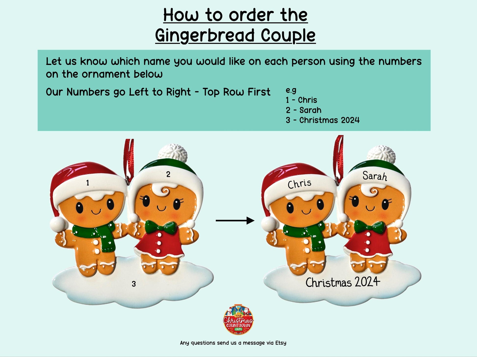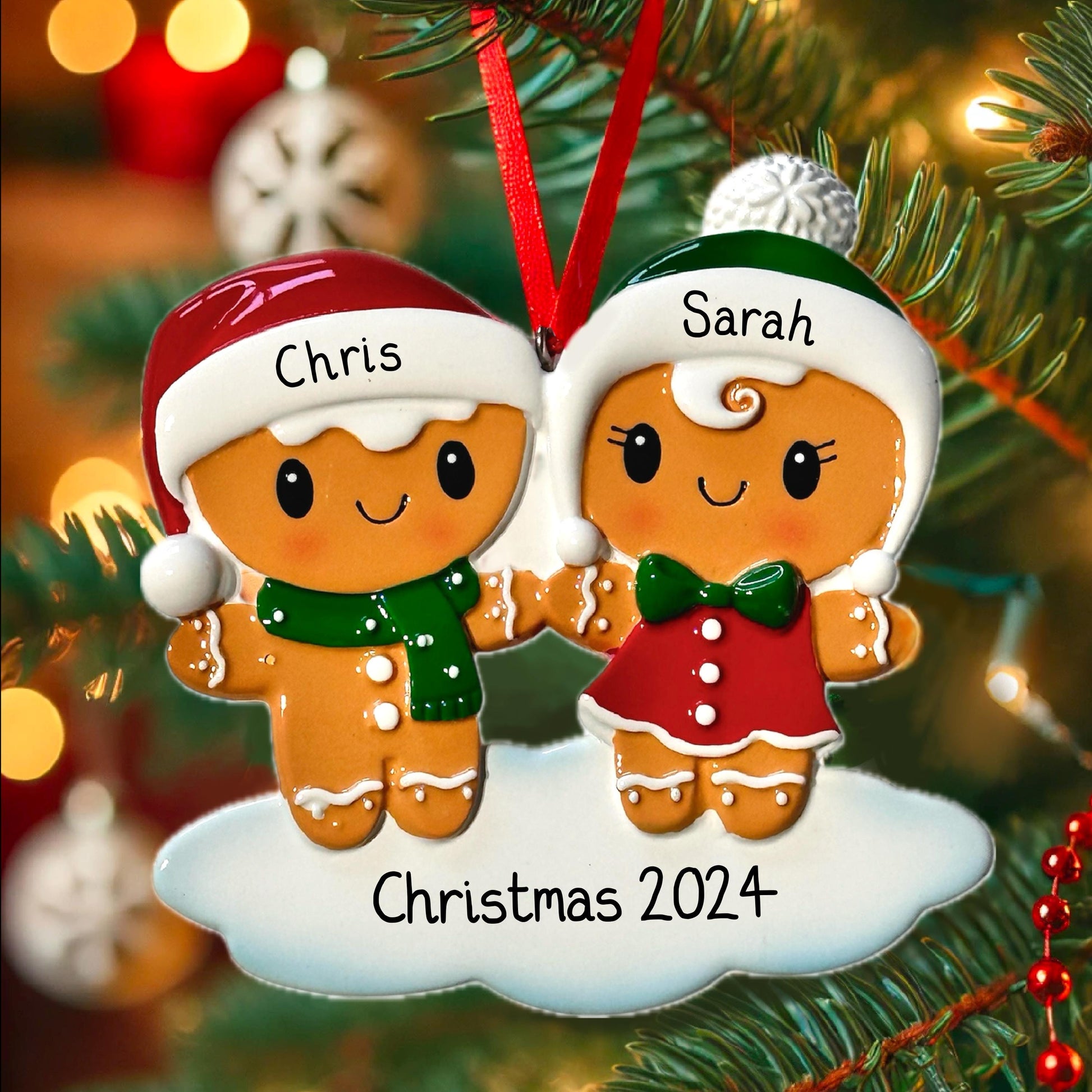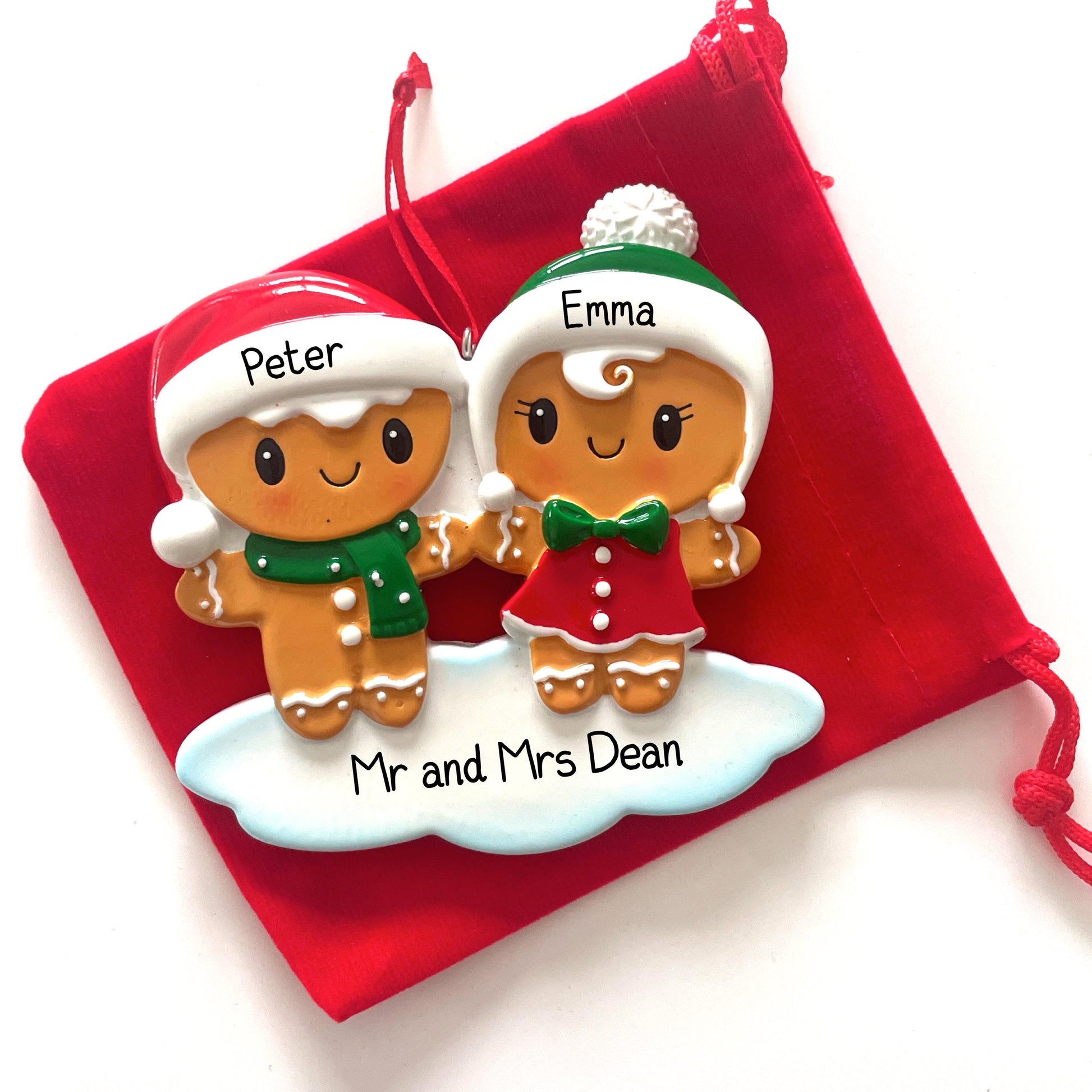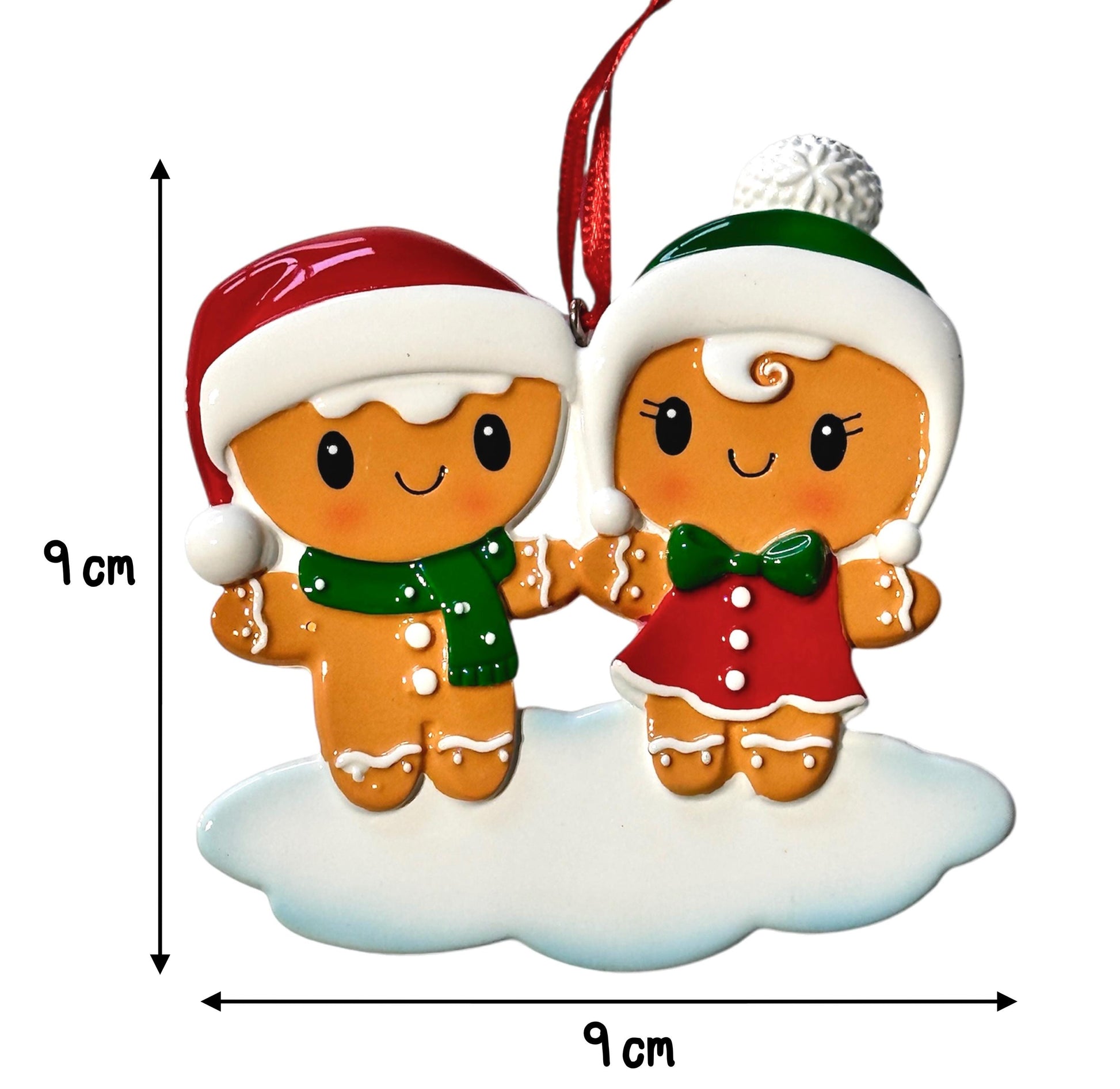Christmas Gingerbread Couple Ornament Celebrate love and sweetness this holiday season with our charming Christmas Gingerbread Couple Ornament! Perfect for couples, whether you're newlyweds, boyfriend and girlfriend, or long-time partners, this adorable tree decoration adds a touch of festive cheer to your holiday decor. Each piece comes ready to hang with a festive red ribbon, and you can choose to include a luxurious red velvet gift bag for an extra special touch. Personalization Details Each person's hat can be hand-personalized with a name in black ink on the white area of the hat. Please provide the names in the order you’d like them to appear, starting from the left most person and moving right. Additional Customization Text can be added to the bottom such as Christmas 2024, Merry Christmas or Your Family Name. Please specify any additional text; otherwise, it will be left blank. Remember to double-check spellings for accuracy! Product Details Crafted from durable polyresin, this ornament is designed to last and become a favourite part of your holiday decorations for years to come. Size - 9cm x 9cm (Approx)