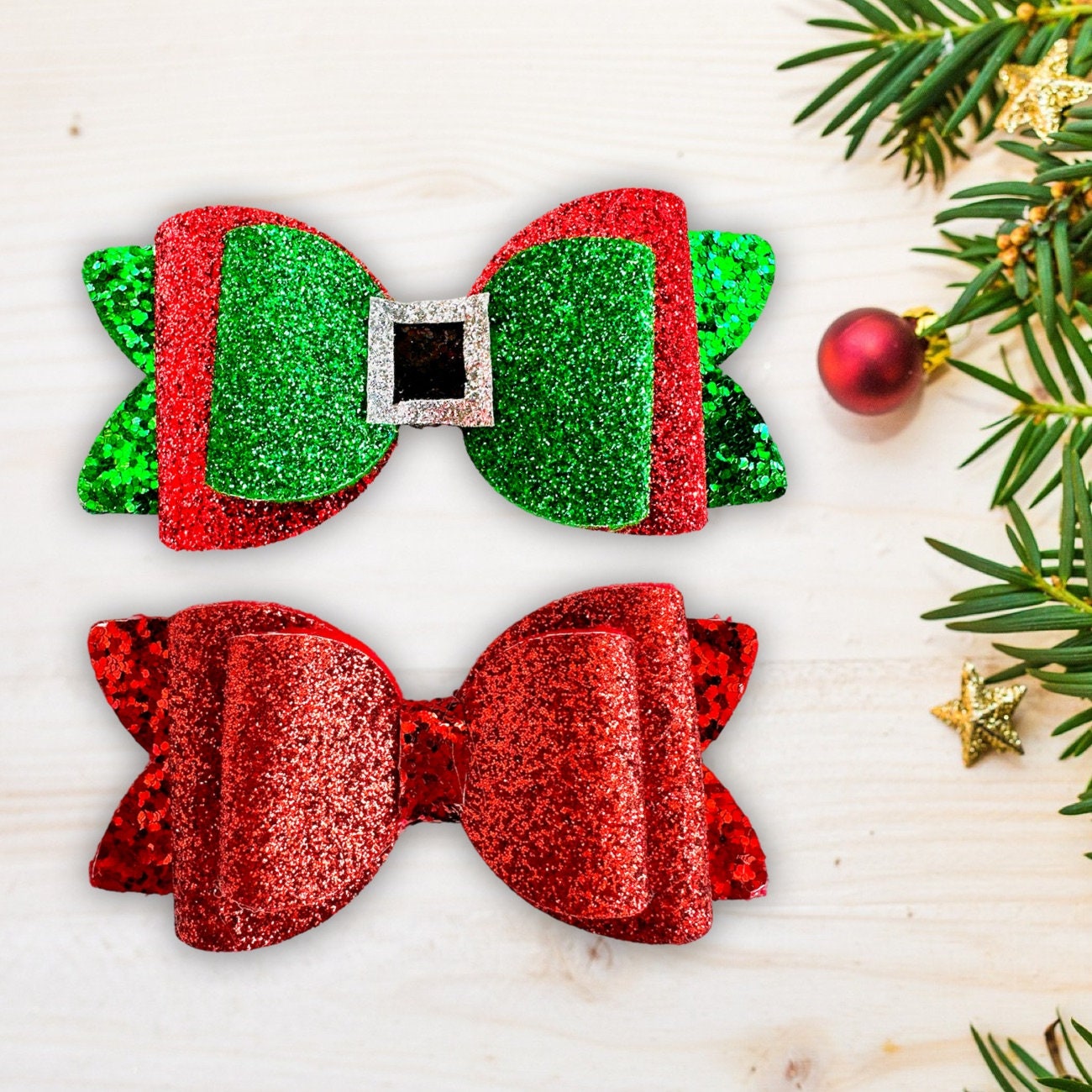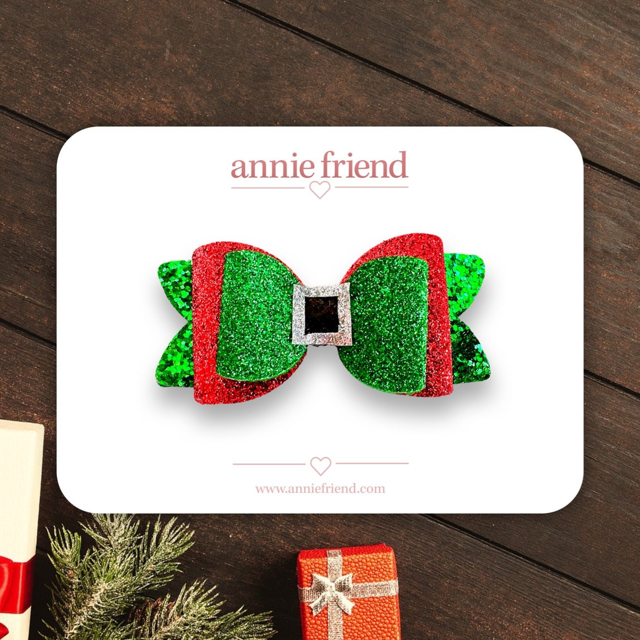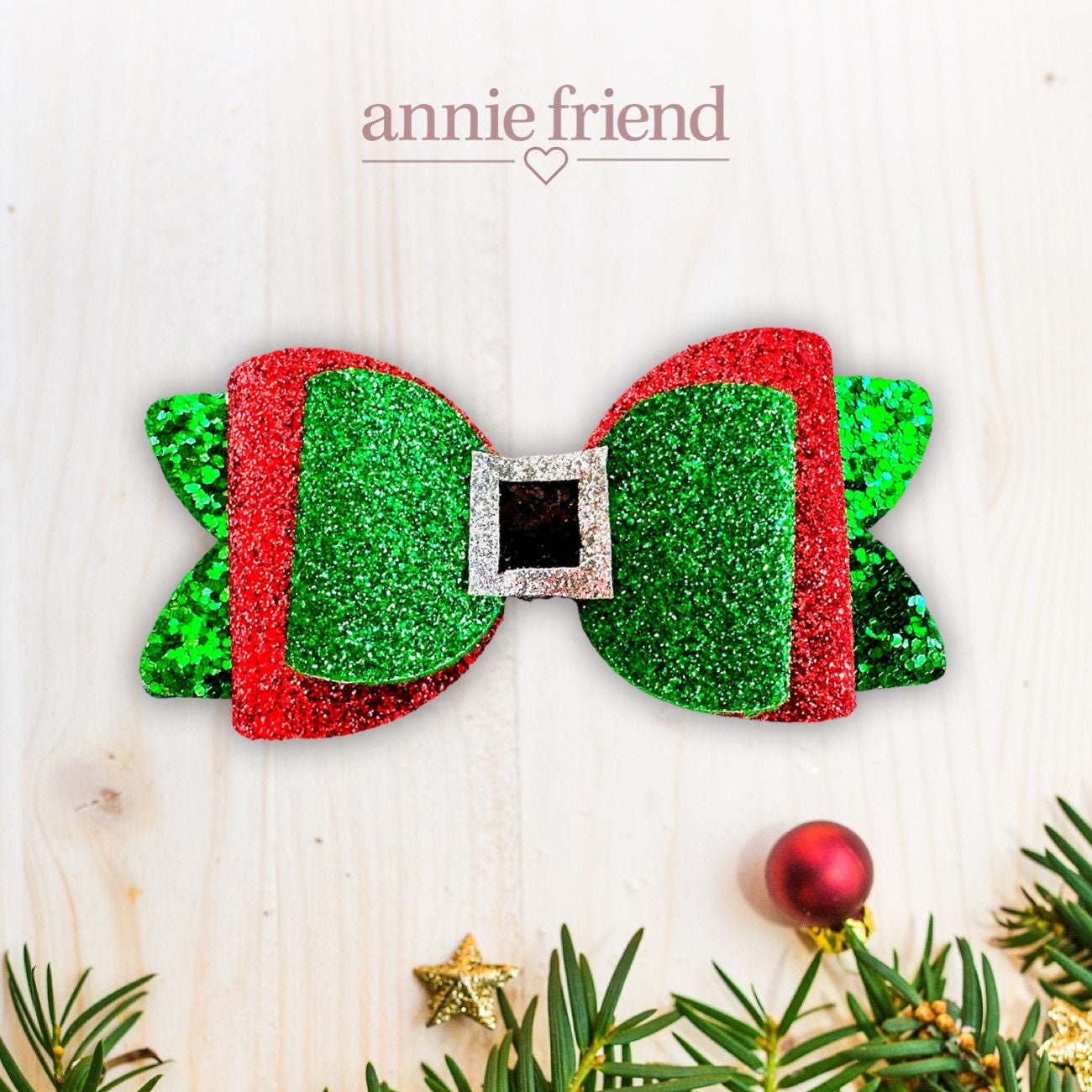 Gorgeous hand made Elf belt hair bow made with glitter fabric.