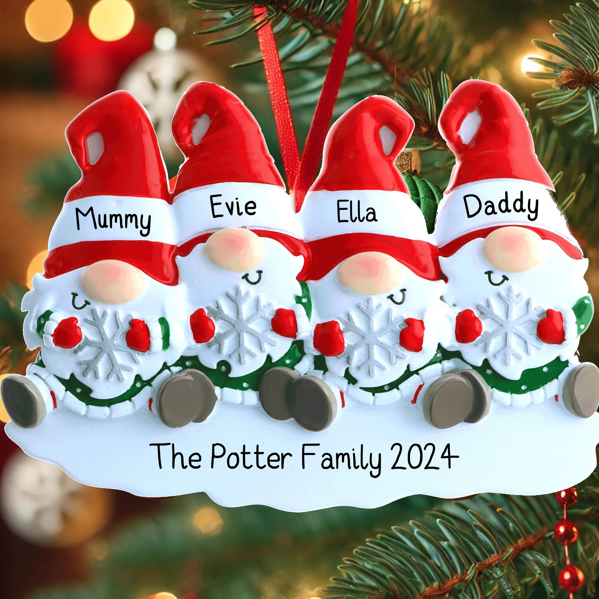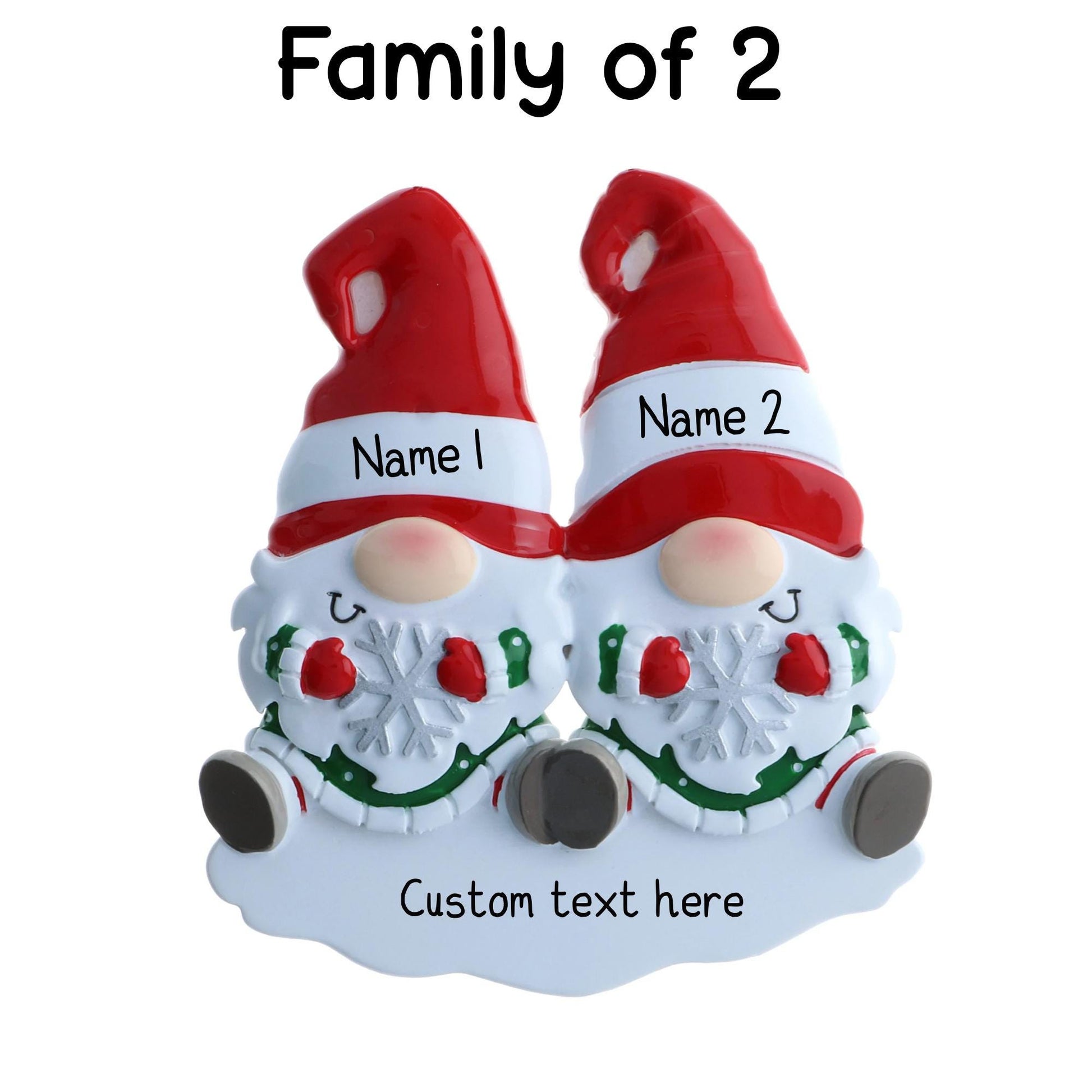 Each Gonk's hat can be hand-personalized with a name in black ink on the white area of the hat. Please provide the names in the order you’d like them to appear, starting from the left most Gonk and moving right. Additional Customization Text can be added to the bottom such as Christmas 2024, Merry Christmas or Your Family Name.