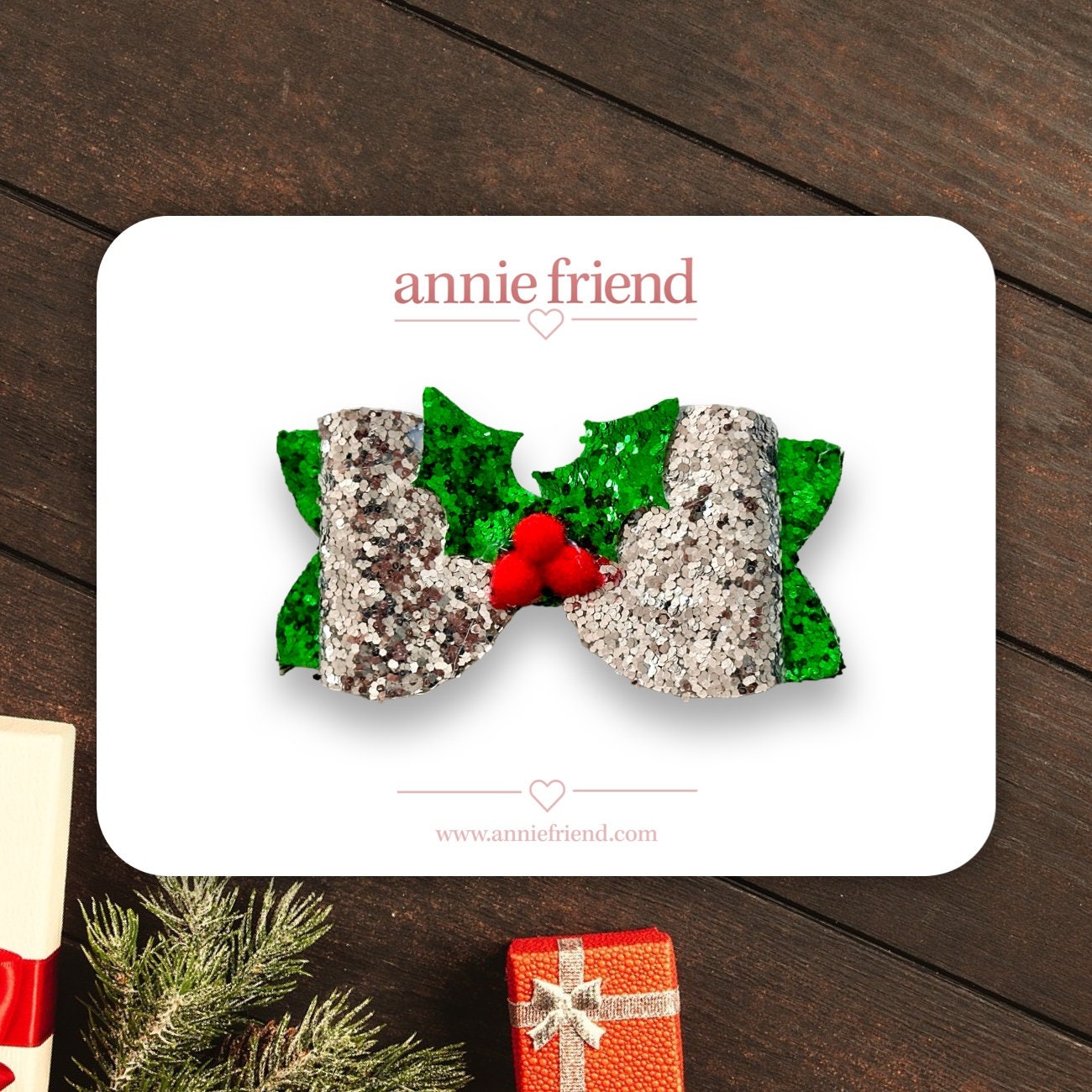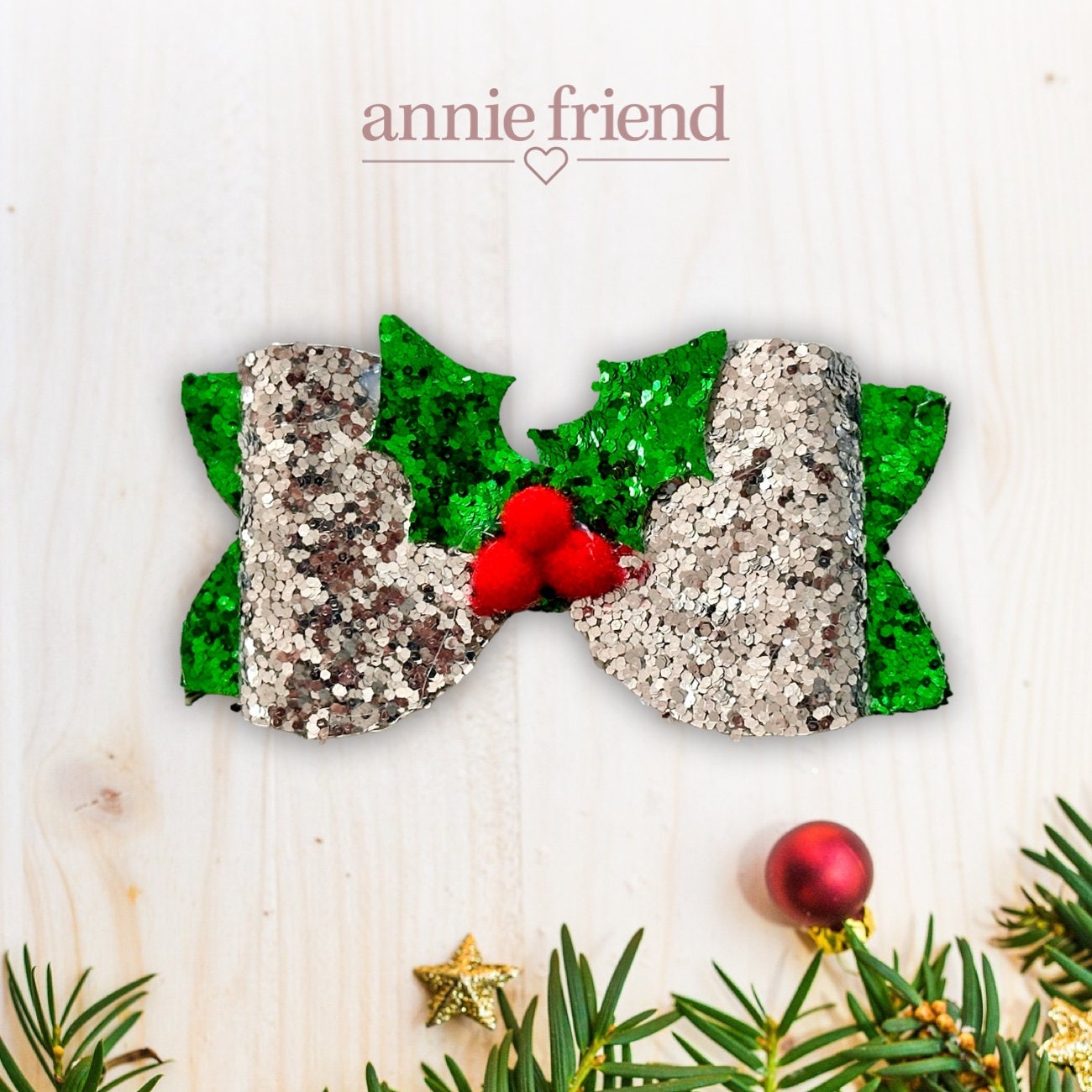 Gorgeous hand made Holly leaf and berries hair bow made with chunky glitter fabric and felt