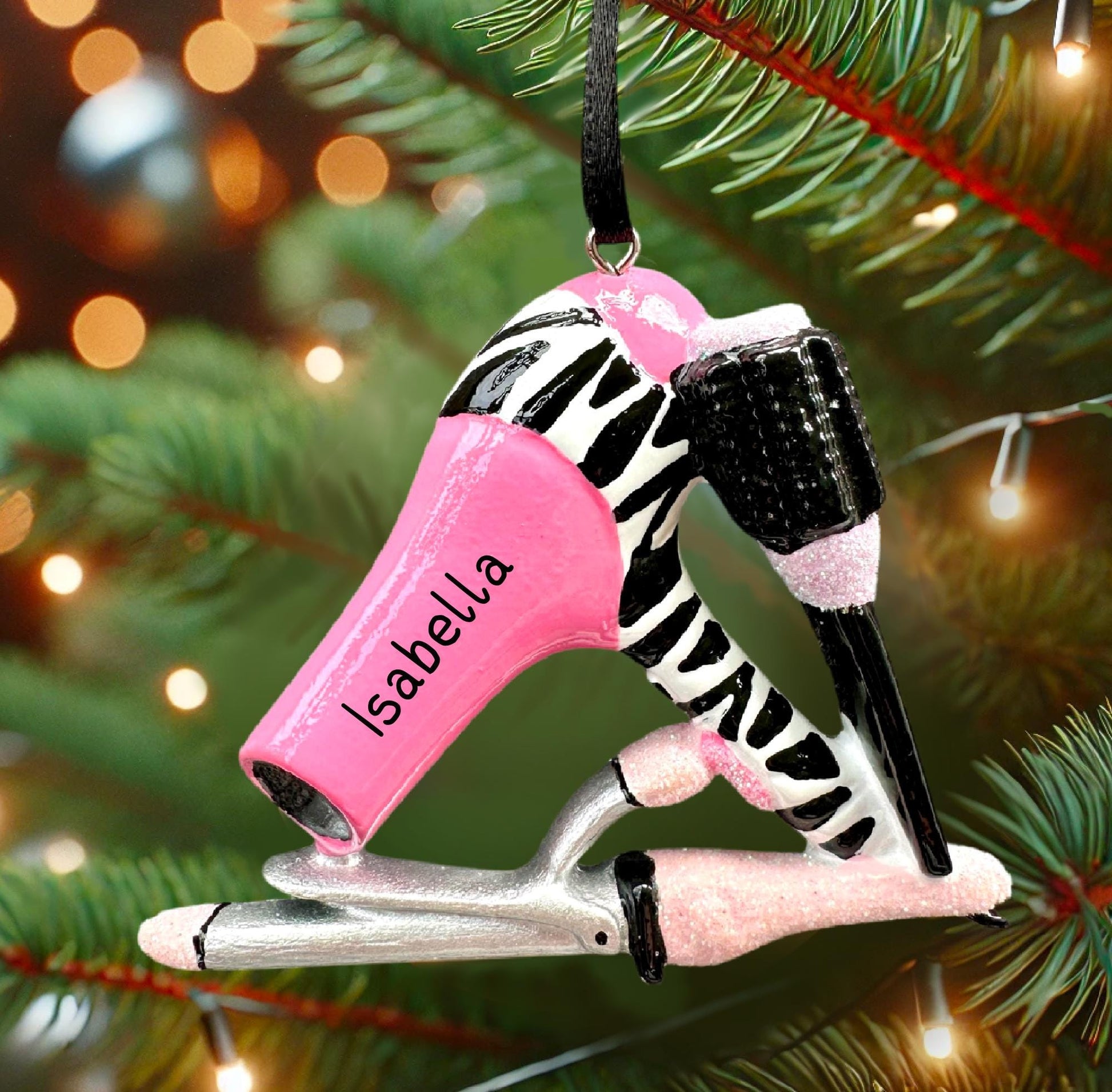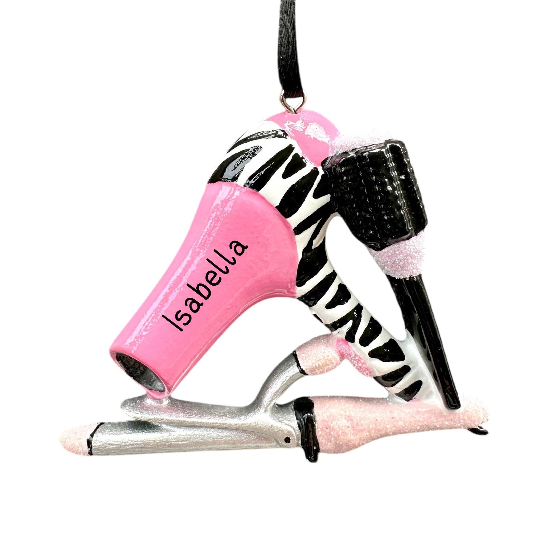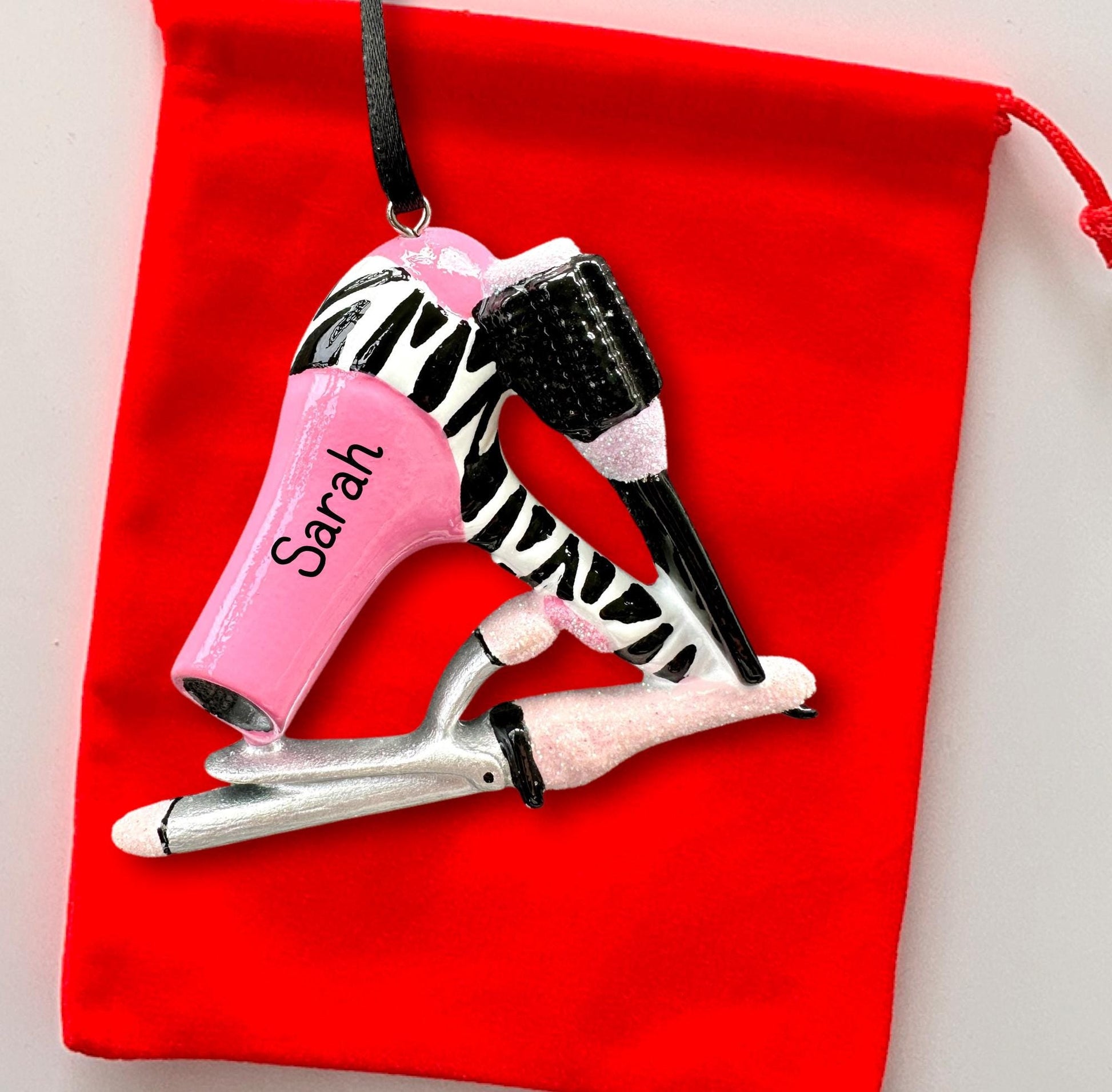 Celebrate the passion for hairstyling with this fabulous Hairdresser Ornament! Perfect for a newly qualified hairstylist, a hairdressing student, or simply someone who adores all things pink and glam, this ornament features a cute pink zebra-patterned hairdryer, curling iron, and brush combo that brings a touch of style to any Christmas tree.