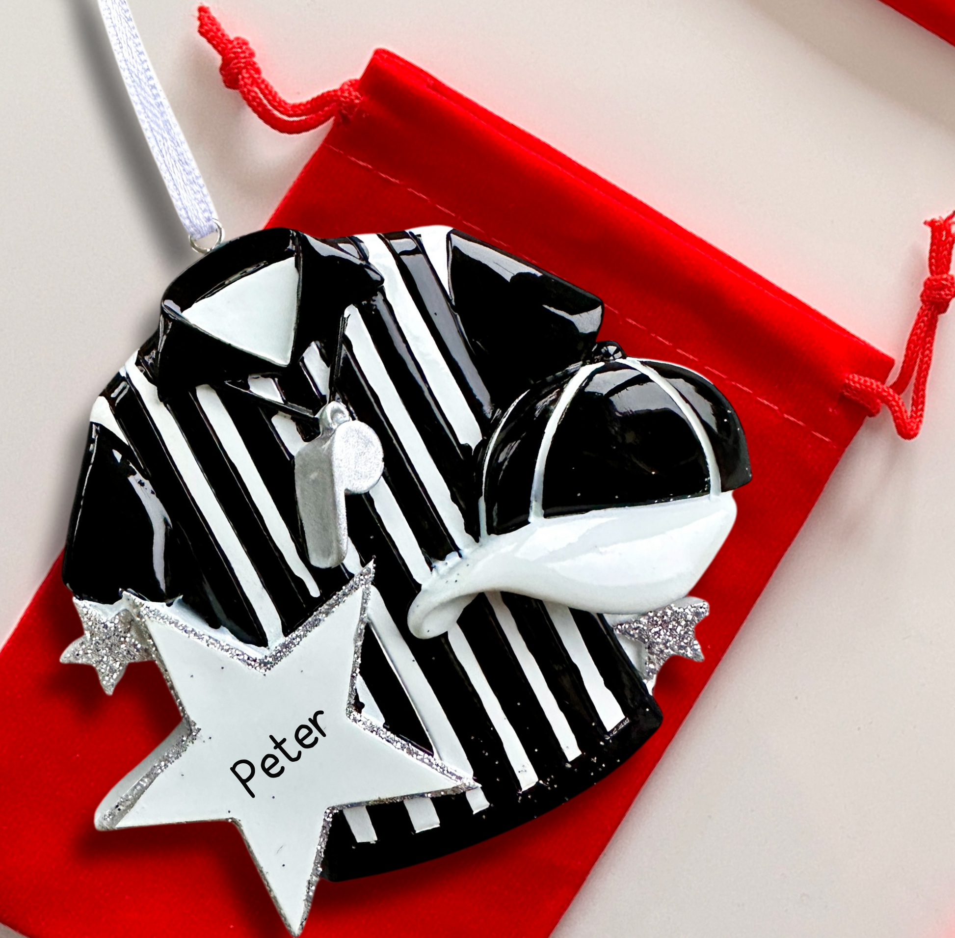 This Personalised Referee Bauble is the perfect keepsake for the referees in your life who call the shots on and off the field! Featuring a sleek bauble design with a sparkly silver star ✨, this ornament adds a festive flair to any Christmas tree.