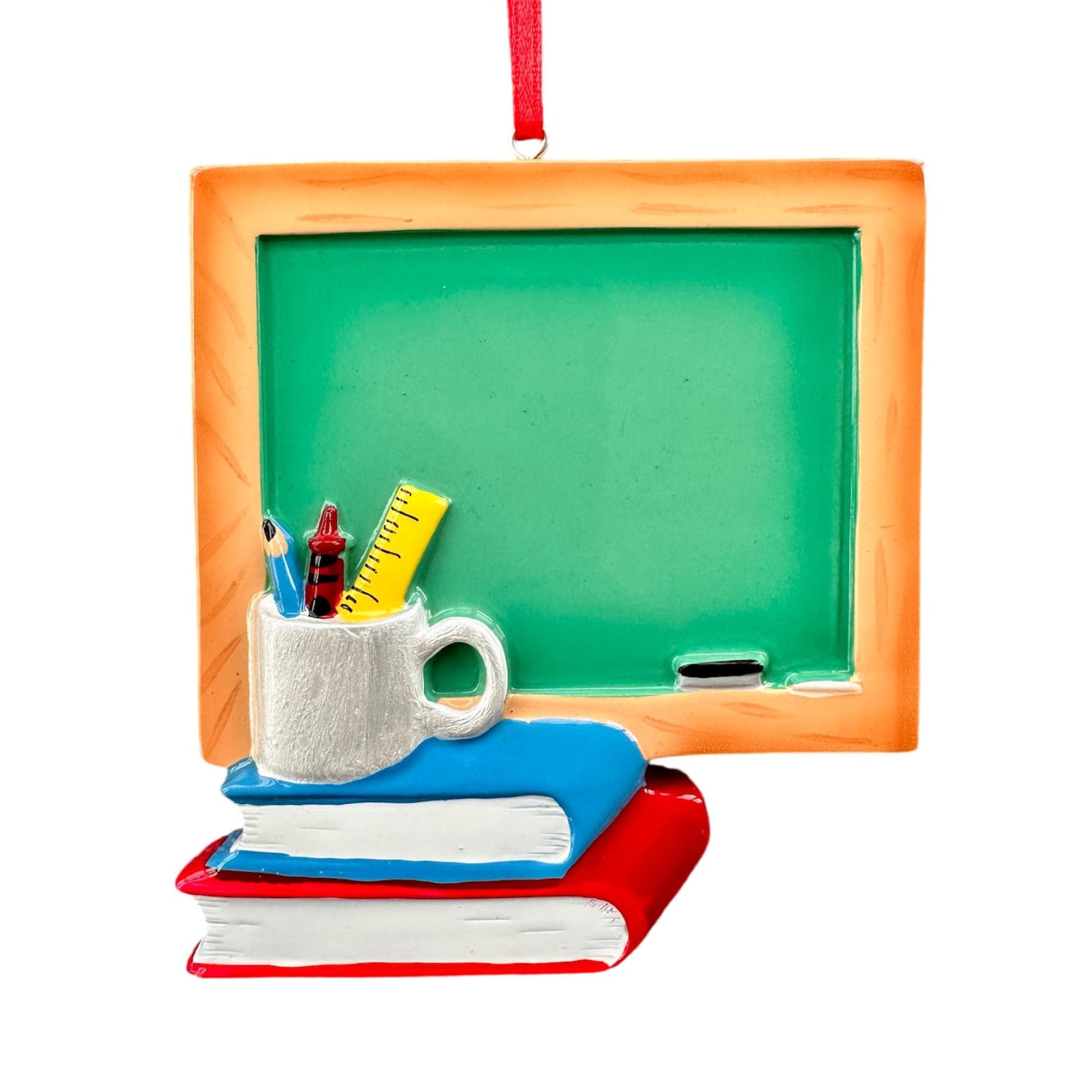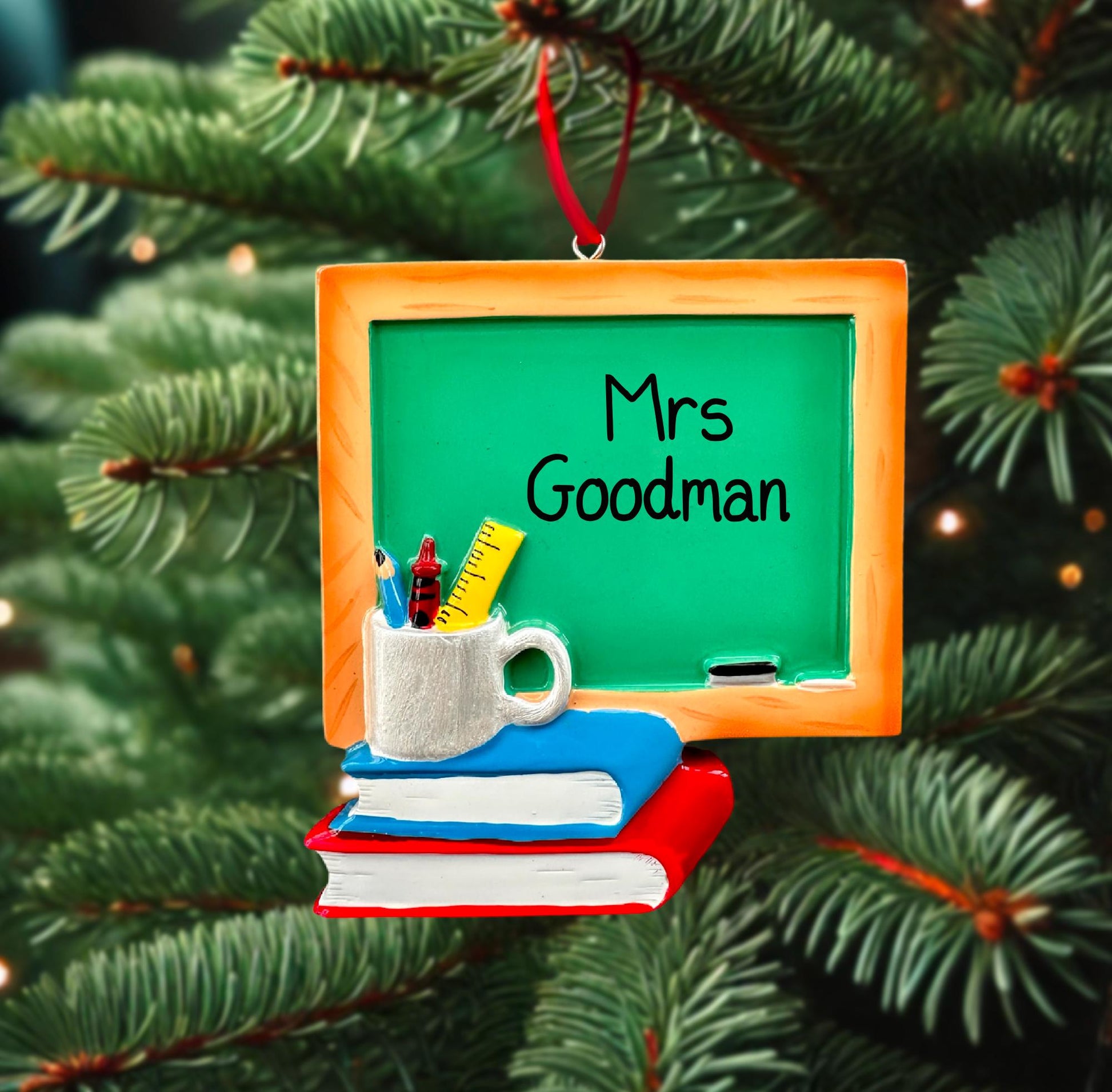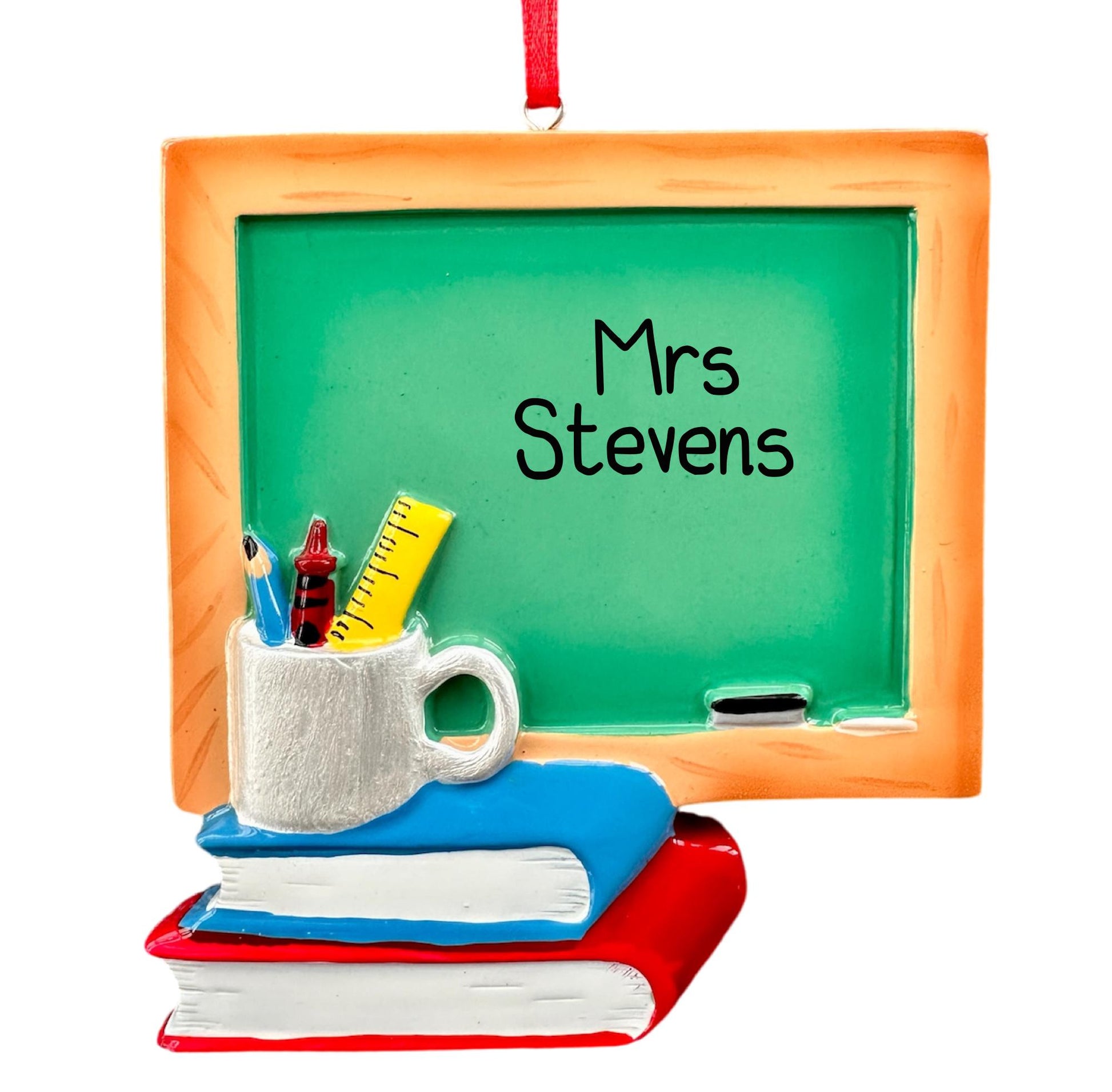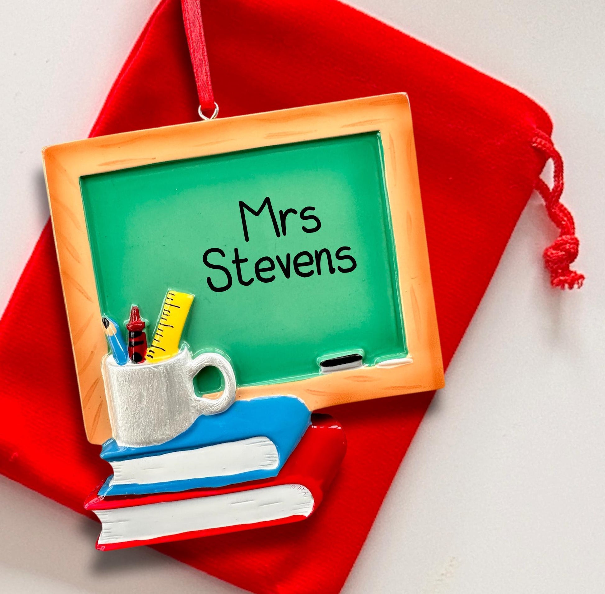 Personalised Teacher Bauble Show your appreciation for a wonderful teacher this holiday season with this delightful personalised Christmas ornament! Designed to capture the essence of a teacher’s desk, this charming decoration features a festive string of colourful lights, a stack of bright books, a classic red apple, and a mug reading “Best Teacher Ever.” At the center is a space to personalise with the teacher’s name, making this a heartfelt and unique gift they’ll treasure. Perfect for hanging on the Christmas tree or displaying on a desk, this ornament is a thoughtful way to say thank you to a dedicated educator. Crafted with attention to detail and high-quality materials, it’s designed to bring a smile and remind them of the positive impact they have on their students. Each piece comes ready to hang with a festive red ribbon, and you can choose to include a luxurious red velvet gift bag for an extra special touch. Personalization Details Text can be added to the green board Please specify any additional text; otherwise, it will be left blank. Remember to double-check spellings for accuracy! Product Details Crafted from durable polyresin, this ornament is designed to last and become a favourite part of your holiday decorations for years to come. Size - 10cm x 9cm (Approx)