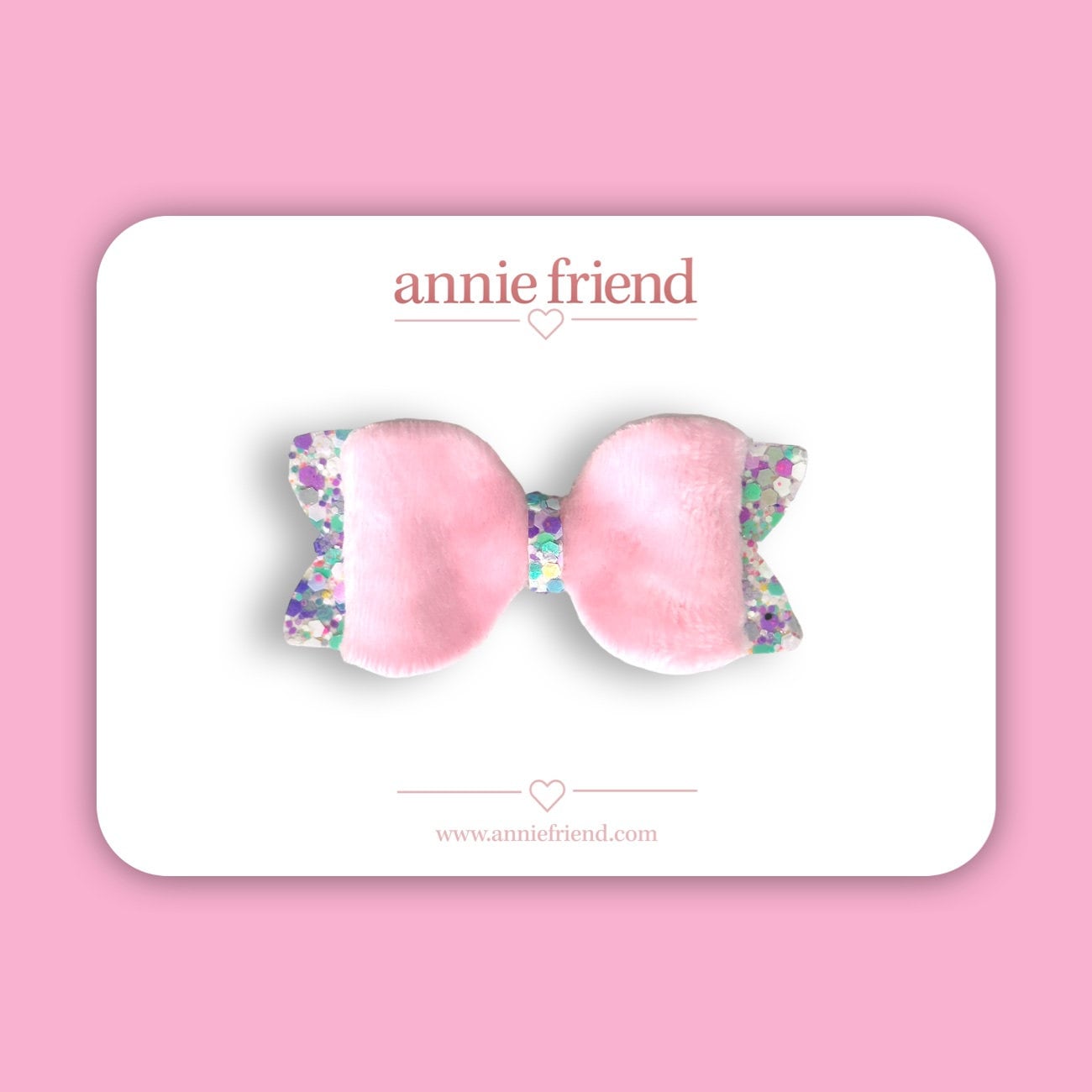 Gorgeous baby pink coloured soft fabric bow with a chunky unicorn colour glitter back layer. Available as 1 bow or 2 bows packs.